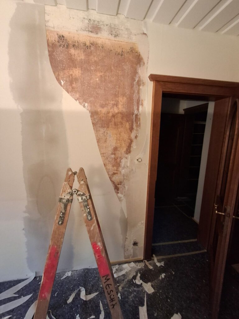 Die vorhandenen Tapeten wiesen alters- und feuchtigkeitsbedingte Schäden auf. Nach sorgfältiger Entfernung der Altbeläge wurden die Untergründe geprüft, ausgebessert und für die weitere Bearbeitung vorbereitet.