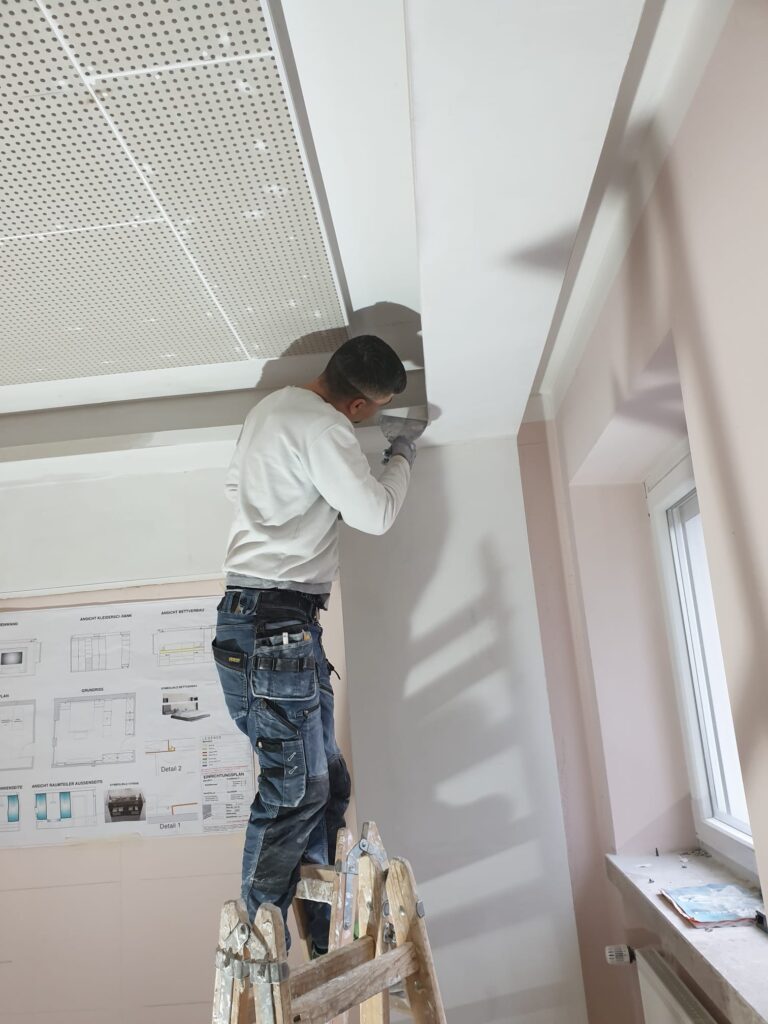 Gerade bei Innenausbauprojekten im Bestand ist Genauigkeit entscheidend. Unebenheiten wurden fachgerecht ausgeglichen, Anschlüsse exakt verspachtelt und Oberflächen für die weitere Gestaltung vorbereitet.